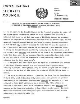 Report on the financial situation in respect of the United Nations Operation in Cyprus, as at 19 November 1965 / by the Secretary-General