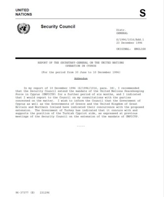 Report of the Secretary-General on the United Nations Operation in Cyprus, for the period from 30 June to 10 December 1996