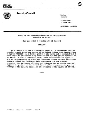 Report of the Secretary-General on the United Nations Operation in Cyprus, for the period 1 December 1991-31 May 1992