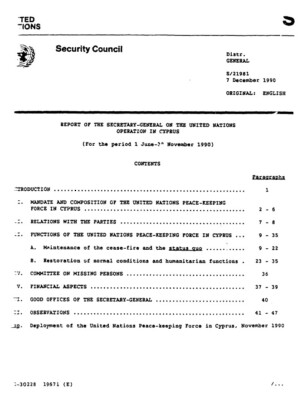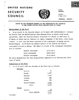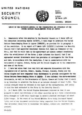 Report on the organization and operation of the United Nations Peacekeeping Force in Cyprus