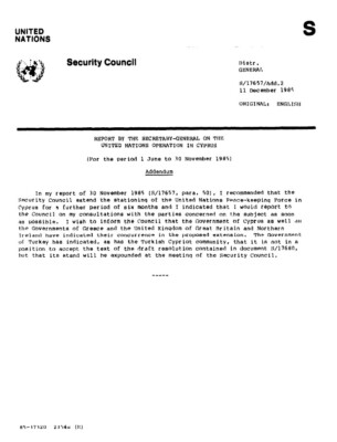 Report on the organization and operation of the United Nations Peacekeeping Force in Cyprus : addendum
