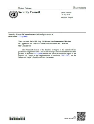 Note verbale dated 19 July 2018 from the Permanent Mission of Cyprus to the United Nations addressed to the Chair of the Committee: Security Council Committee Established pursuant to Resolution 1718 (2006)