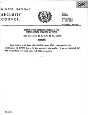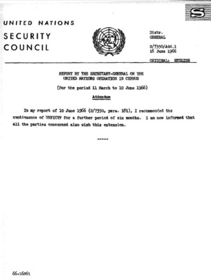 Report by the Secretary-General on the United Nations Operation in Cyprus : (for the period 11 March to 10 June 1966) : addendum