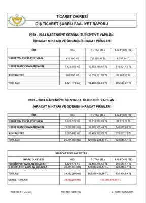 2023-2024 narenciye sezonu Türkiye’ye yapılan ihracat miktarı ve ödenen ihracat primleri