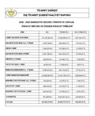 2022-2023 narenciye sezonu Türkiye’ye yapılan ihracat miktarı ve ödenen ihracat primleri