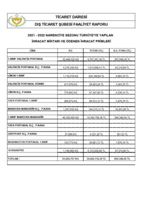 2021-2022 narenciye sezonu Türkiye’ye yapılan ihracat miktarı ve ödenen ihracat primleri