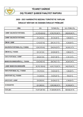 2020-2021 narenciye sezonu Türkiye’ye yapılan ihracat miktarı ve ödenen ihracat primleri