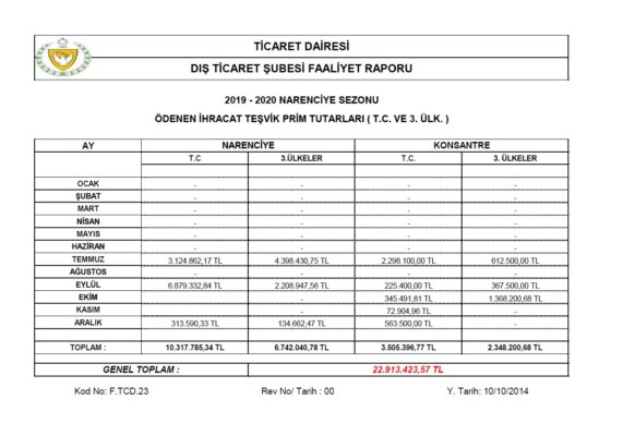 2019-2020 narenciye sezonu ödenen ihracat teşvik prim tutarları (T.C. ve 3. ülk.)