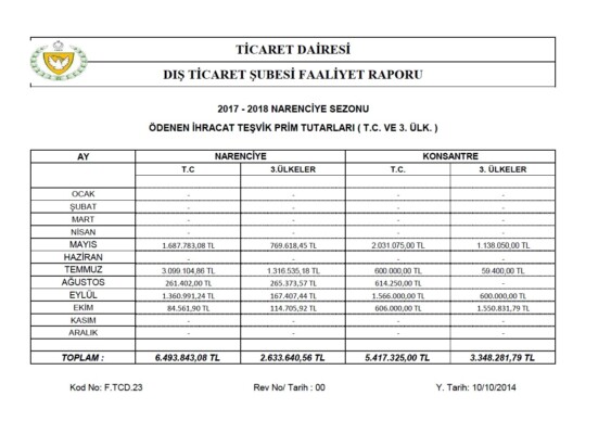 2017-2018 narenciye sezonu ödenen ihracat teşvik prim tutarları (T.C. ve 3. ülk.)