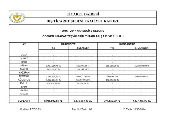 2016-2017 narenciye sezonu ödenen ihracat teşvik prim tutarları (T.C. ve 3. ülk.)