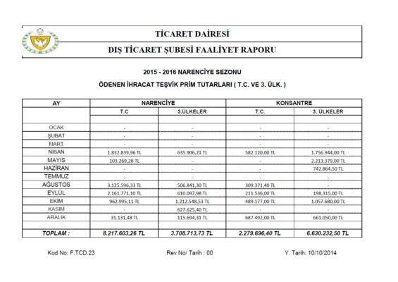 2014-2015 narenciye sezonu ödenen ihracat teşvik prim tutarları (T.C. ve 3. ülk.)