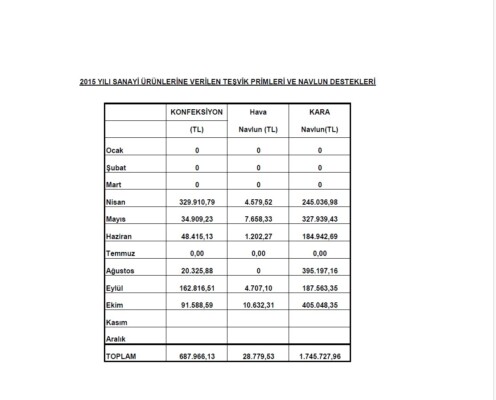 2015 yılı sanayi ürünlerine verilen teşvik primleri ve navlun destekleri