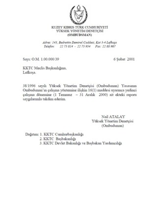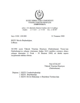 Yüksek Yönetim Denetçisi (Ombudsman)’ın Ocak-Haziran 2000 Raporu