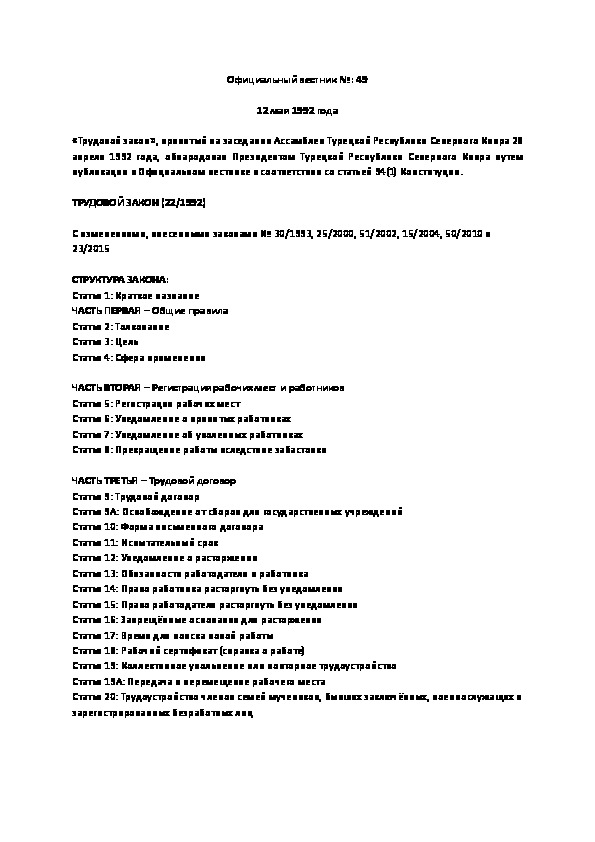 The “Labor Law,” adopted at the session of the Assembly of the Turkish Republic of Northern Cyprus on 28 April 1992, is hereby promulgated by the President of the Turkish Republic of Northern Cyprus by being published in the Official Gazette in accordance with Article 94(1) of the Constitution.