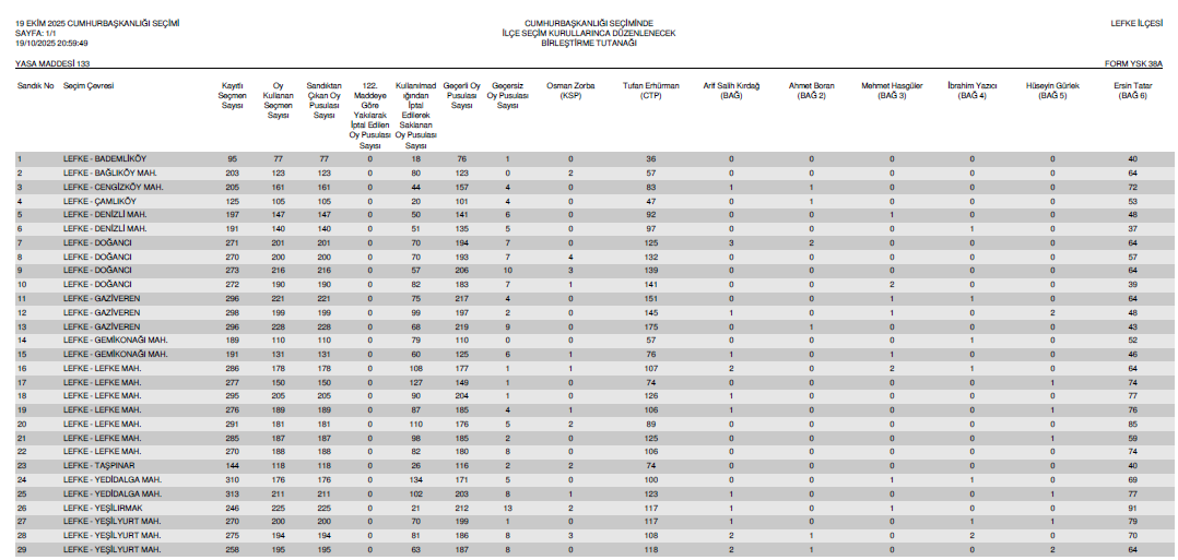 | Yayın Adı | 19 Ekim 2025 Cumhurbaşkanlığı seçimi: Cumhurbaşkanlığı seçiminde ilçe seçim kurullarınca düzenlenecek birleştirme tutanağı (Lefke ilçesi) |