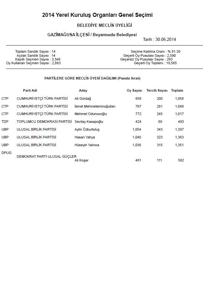 | Yayın Adı | 2014 yerel kuruluş organları genel seçimi: Belediye meclis üyeliği (Gazimağusa ilçesi/Beyarmudu Belediyesi) |