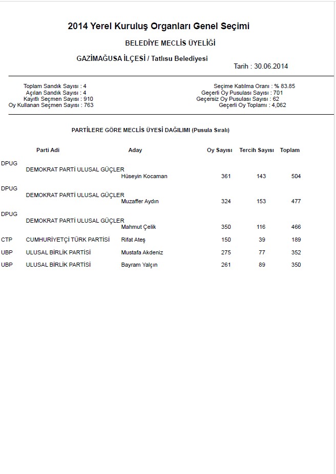 | Yayın Adı | 2014 yerel kuruluş organları genel seçimi: Belediye meclis üyeliği (Gazimağusa ilçesi/Tatlısu Belediyesi) |