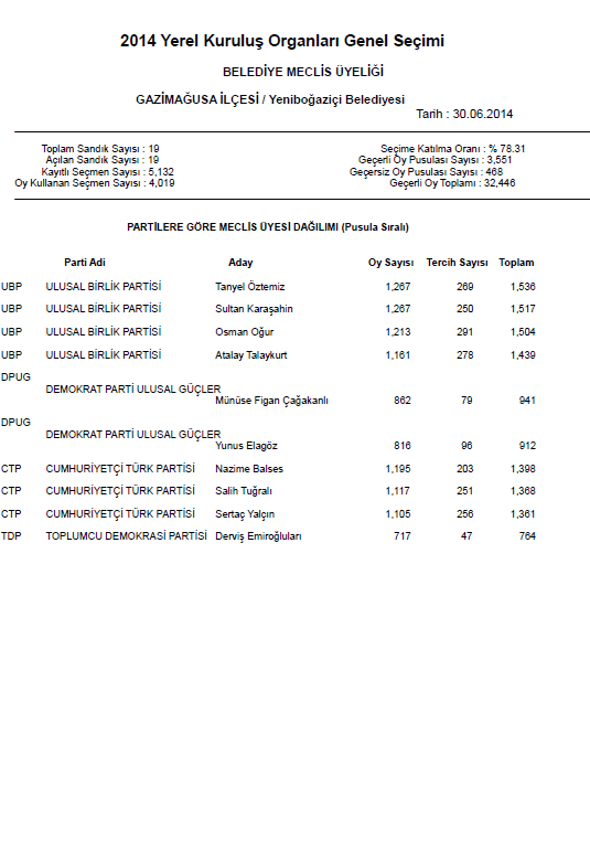| Yayın Adı | 2014 yerel kuruluş organları genel seçimi: Belediye meclis üyeliği (Gazimağusa ilçesi/Yeniboğaziçi Belediyesi) |