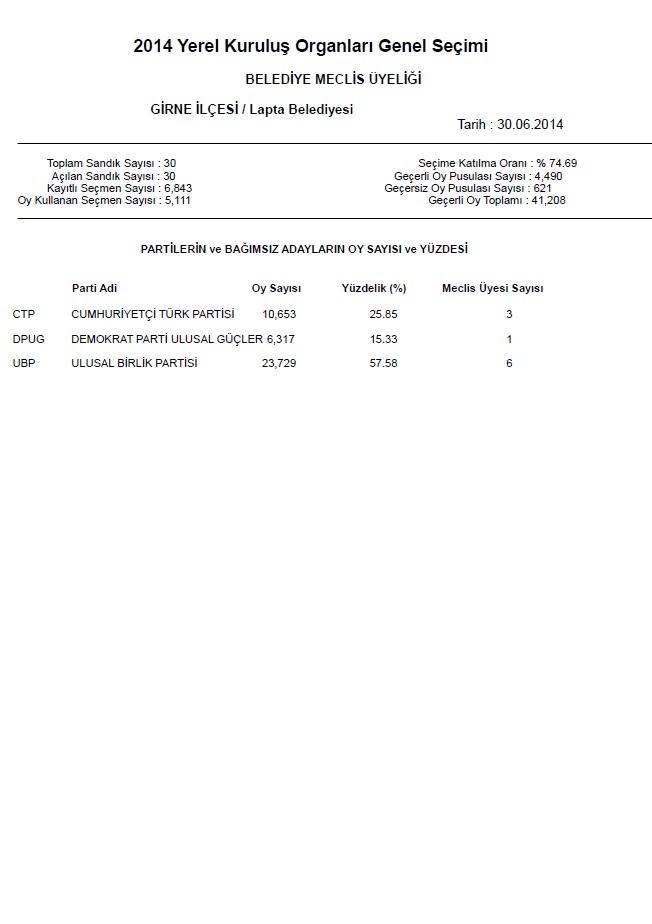 | Yayın Adı | 2014 yerel kuruluş organları genel seçimi: Belediye meclis üyeliği (Girne ilçesi/Lapta Belediyesi) |