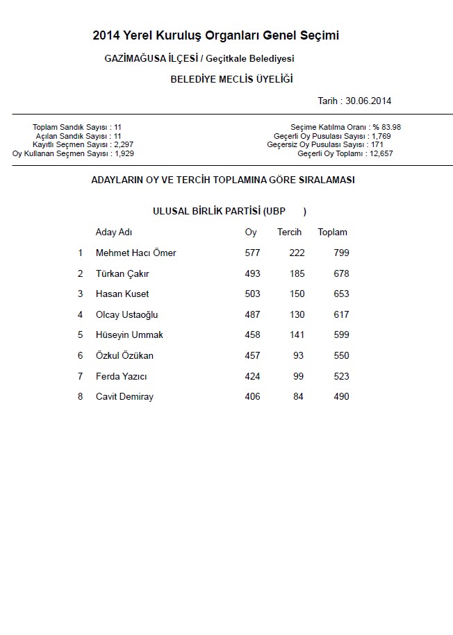 | Yayın Adı | 2014 yerel kuruluş organları genel seçimi: Gazimağusa ilçesi/Geçitkale Belediyesi (Belediye meclis üyeliği) |