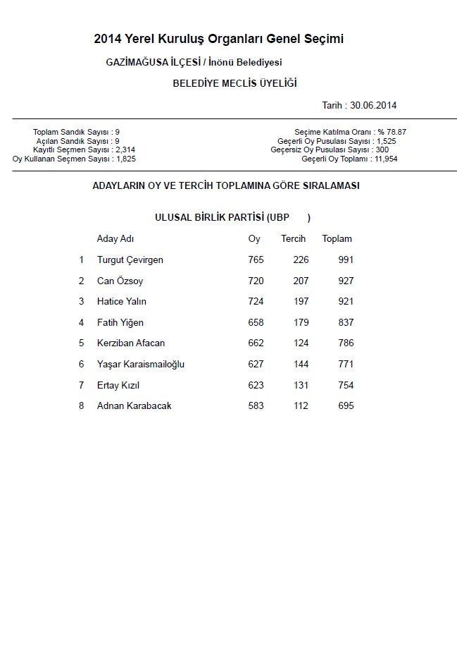 | Yayın Adı | 2014 yerel kuruluş organları genel seçimi: Gazimağusa ilçesi/İnönü Belediyesi (Belediye meclis üyeliği) |