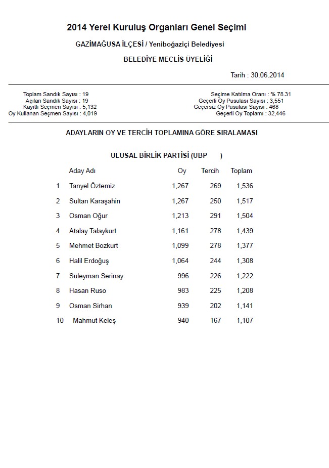 | Yayın Adı | 2014 yerel kuruluş organları genel seçimi: Gazimağusa ilçesi/Yeniboğaziçi Belediyesi (Belediye meclis üyeliği) |