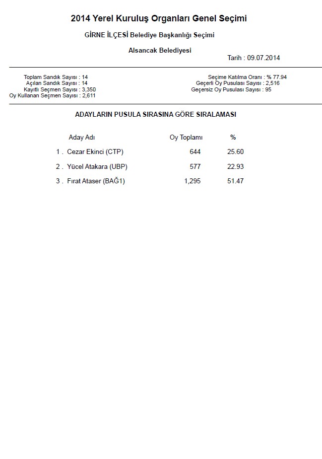 | Yayın Adı | 2014 yerel kuruluş organları genel seçimi: Girne ilçesi belediye başkanlığı seçimi |