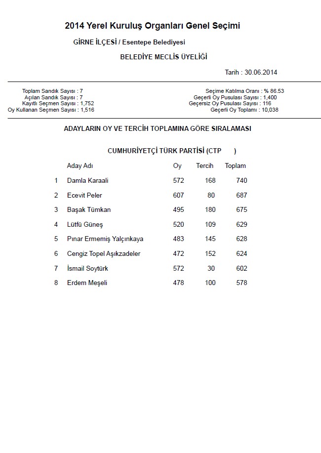 | Yayın Adı | 2014 yerel kuruluş organları genel seçimi: Girne ilçesi/Esentepe Belediyesi (Belediye meclis üyeliği) |