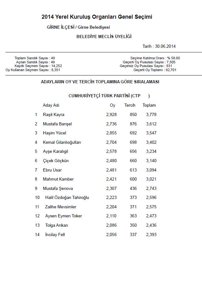 | Yayın Adı | 2014 yerel kuruluş organları genel seçimi: Girne ilçesi/Girne Belediyesi (Belediye meclis üyeliği) |