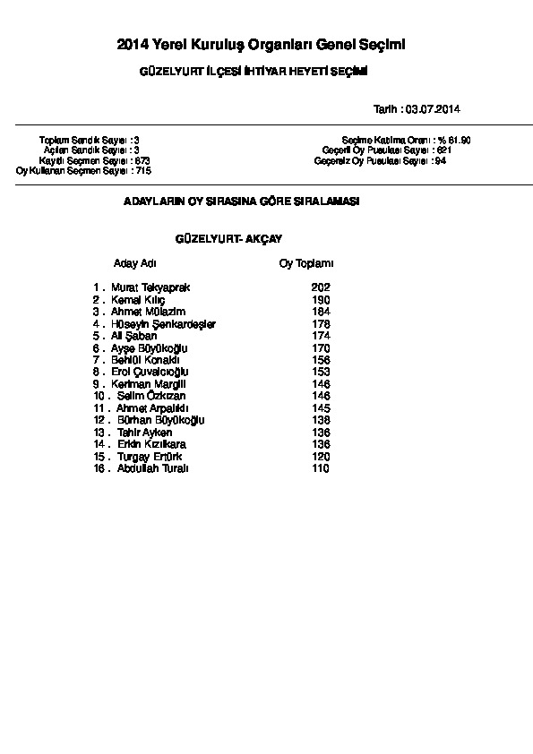| Yayın Adı | 2014 yerel kuruluş organları genel seçimi: Güzelyurt ilçesi ihtiyar heyeti seçimi (Adayların oy sırasına göre sıralaması) |