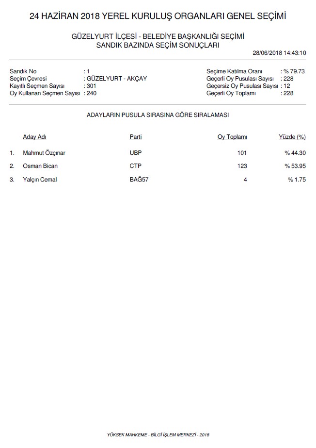 | Yayın Adı | 24 Haziran 2018 yerel kuruluş organları genel seçimi: Güzelyurt ilçesi-Belediye başkanlığı seçimi |