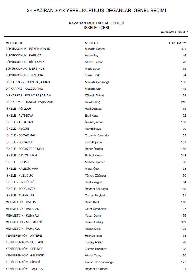 | Yayın Adı | 24 Haziran 2018 yerel kuruluş organları genel seçimi: Kazanan muhtarlar listesi-İskele ilçesi |
