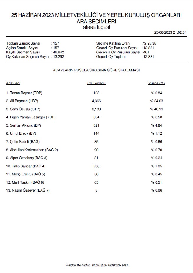 | Yayın Adı | 25 Haziran 2023 milletvekilliği ve yerel kuruluş organları ara seçimleri: Girne ilçesi (Adayların pusula sırasına göre sıralaması) |