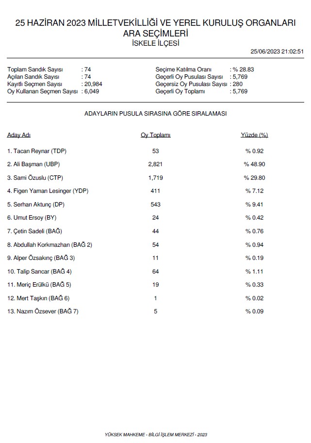 | Yayın Adı | 25 Haziran 2023 milletvekilliği ve yerel kuruluş organları ara seçimleri: İskele ilçesi (Adayların pusula sırasına göre sıralaması) |
