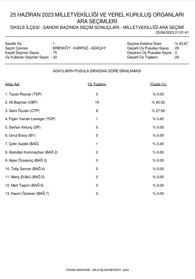 | Yayın Adı | 25 Haziran 2023 milletvekilliği ve yerel kuruluş organları ara seçimleri: İskele ilçesi - Sandık bazında seçim sonuçları - Milletvekilliği ara seçimi |