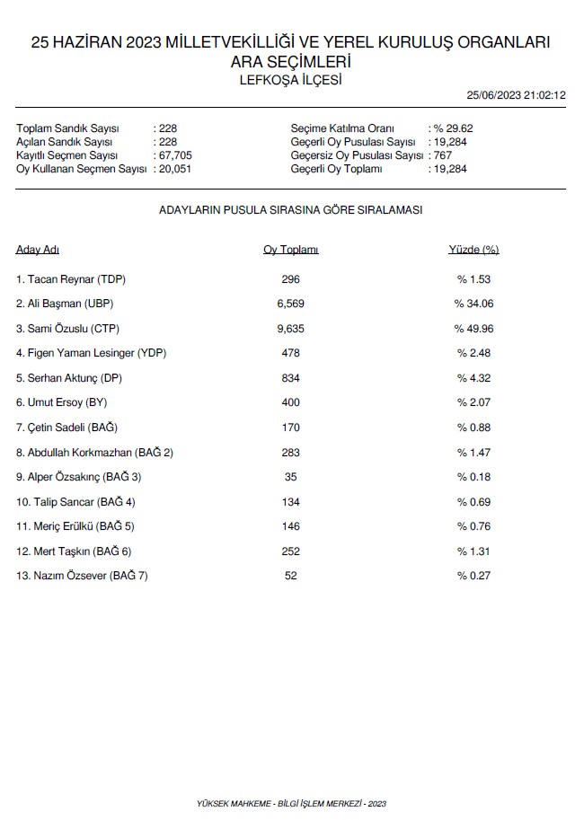 | Yayın Adı | 25 Haziran 2023 milletvekilliği ve yerel kuruluş organları ara seçimleri: Lefkoşa ilçesi (Adayların pusula sırasına göre sıralaması) |