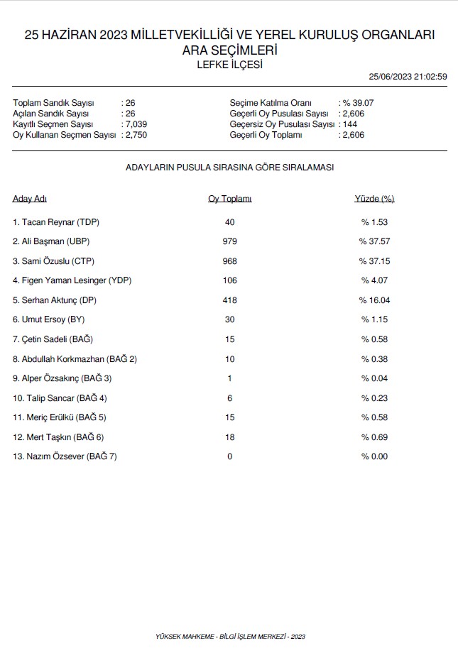 | Yayın Adı | 25 Haziran 2023 milletvekilliği ve yerel kuruluş organları ara seçimleri: Lefkoşa ilçesi - Sandık bazında seçim sonuçları - Milletvekilliği ara seçimi |