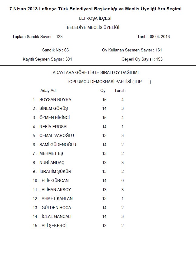 | Yayın Adı | 7 Nisan 2013 Lefkoşa Türk Belediyesi başkanlığı ve meclis üyeliği ara seçimi: Lefkoşa ilçesi-Belediye meclis üyeliği |