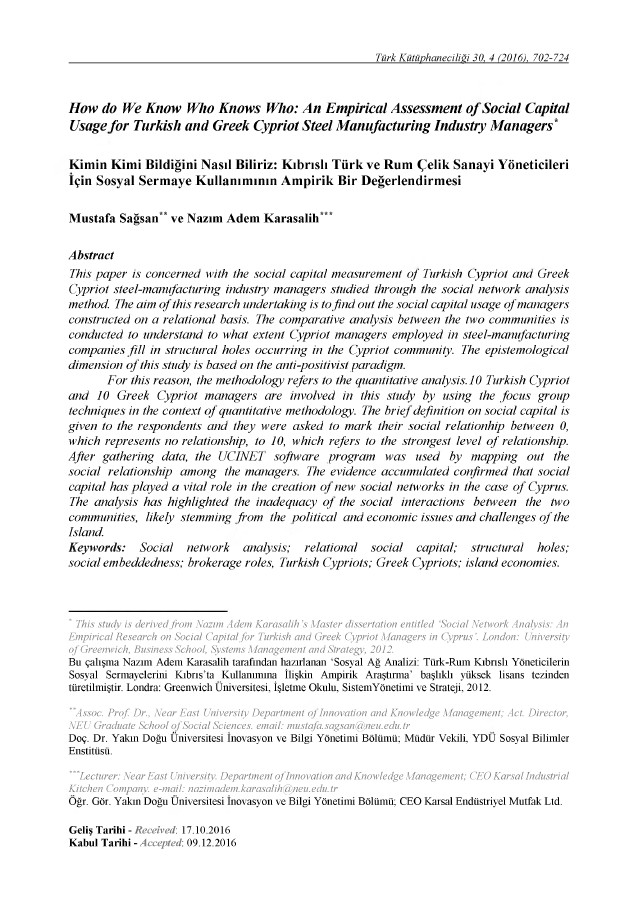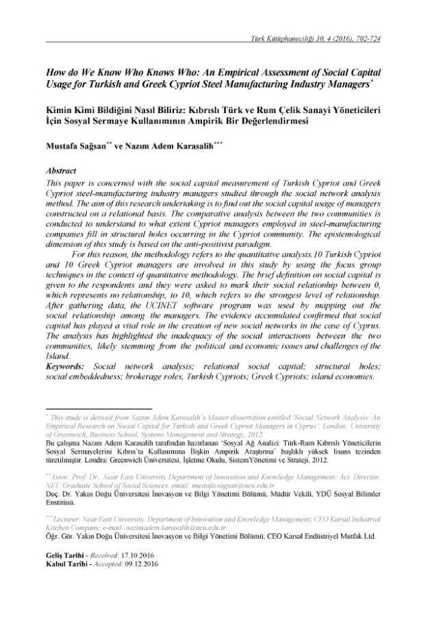 This paper is concerned with the social capital measurement of Turkish Cypriot and Greek Cypriot steel-manufacturing industry managers studied through the social network analysis method. The aim of thisresearch undertaking isto find out the social capital usage of managers constructed on a relational basis. The comparative analysis between the two communities is conducted to understand to what extent Cypriot managers employed in steel-manufacturing companies fill in structural holes occurring in the Cypriot community. The epistemological dimension of this study is based on the anti-positivist paradigm. For this reason, the methodology refers to the quantitative analysis.10 Turkish Cypriot and 10 Greek Cypriot managers are involved in this study by using the focus group techniques in the context of quantitative methodology. The brief definition on social capital is given to the respondents and they were asked to mark their social relationhip between 0, which represents no relationship, to 10, which refers to the strongest level of relationship. After gathering data, the UCINET software program was used by mapping out the social relationship among the managers. The evidence accumulated confirmed that social capital has played a vital role in the creation of new social networks in the case of Cyprus. The analysis has highlighted the inadequacy of the social interactions between the two communities, likely stemming from the political and economic issues and challenges of the Island.