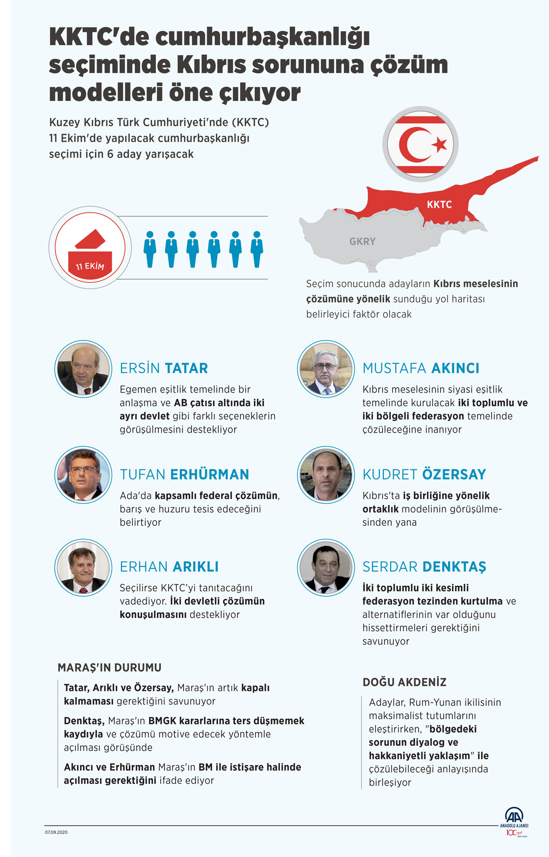 Kuzey Kıbrıs Türk Cumhuriyeti’nde (KKTC) 11 Ekim’de yapılacak cumhurbaşkanlığı seçimi için 6 aday yarışacak ve seçim sonucunda adayların Kıbrıs meselesinin çözümüne yönelik sunduğu yol haritası belirleyici faktör olacak.