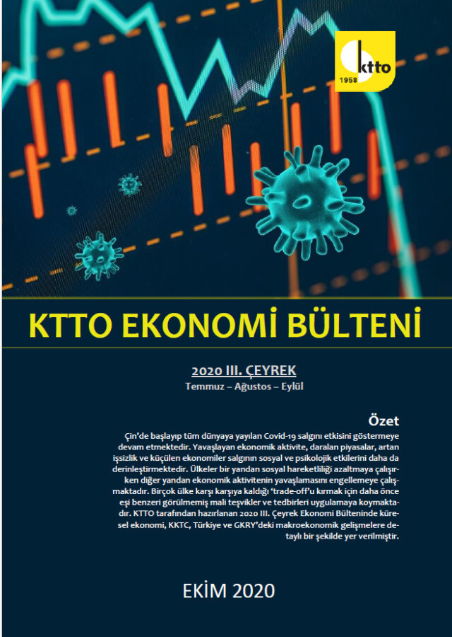 Çin’de başlayıp tüm dünyaya yayılan Covid-19 salgını etkisini göstermeye devam etmektedir. Yavaşlayan ekonomik aktivite, daralan piyasalar, artan işsizlik ve küçülen ekonomiler salgının sosyal ve psikolojik etkilerini daha da derinleştirmektedir. Ülkeler bir yandan sosyal hareketliliği azaltmaya çalışırken diğer yandan ekonomik aktivitenin yavaşlamasını engellemeye çalışmaktadır. Birçok ülke karşı karşıya kaldığı ‘trade-off’u kırmak için daha önce eşi benzeri görülmemiş mali teşvikler ve tedbirleri uygulamaya koymaktadır. KTTO tarafından hazırlanan 2020 III. Çeyrek Ekonomi Bülteninde küresel ekonomi, KKTC, Türkiye ve GKRY’deki makroekonomik gelişmelere detaylı bir şekilde yer verilmiştir.