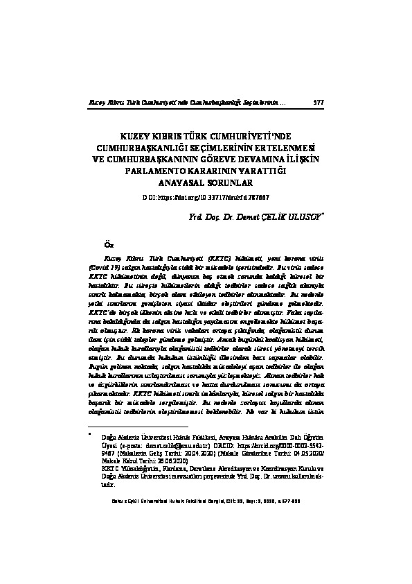 | Yayın Adı | Kuzey Kıbrıs Türk Cumhuriyeti’nde Cumhurbaşkanlığı seçimlerinin ertelenmesi ve Cumhurbaşkanının göreve devamına ilişkin parlamento kararının yarattığı anayasal sorunlar |
