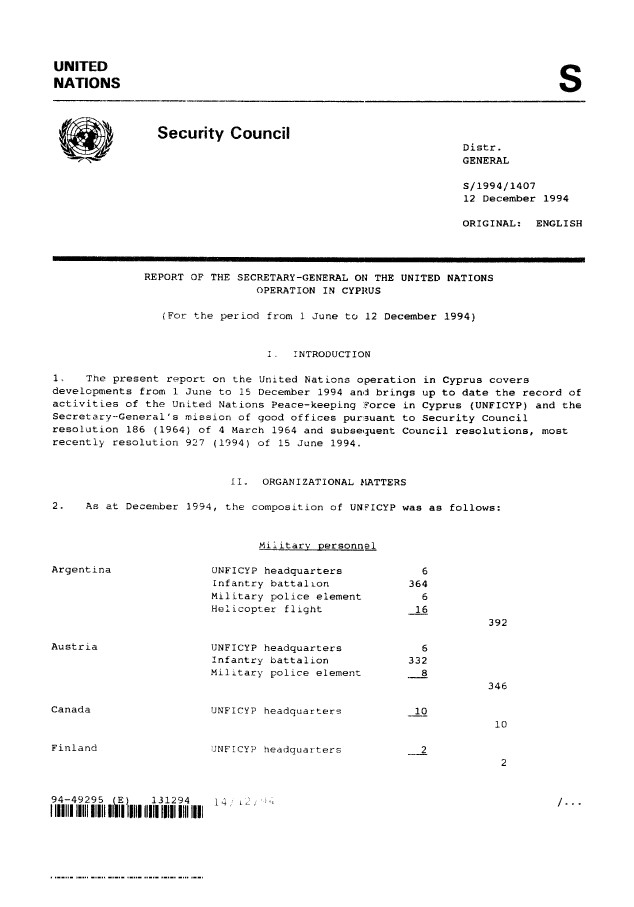 | Yayın Adı | Report of the Secretary-General on the United Nations Operation in Cyprus, for the period from 1 June to 12 December 1994 |