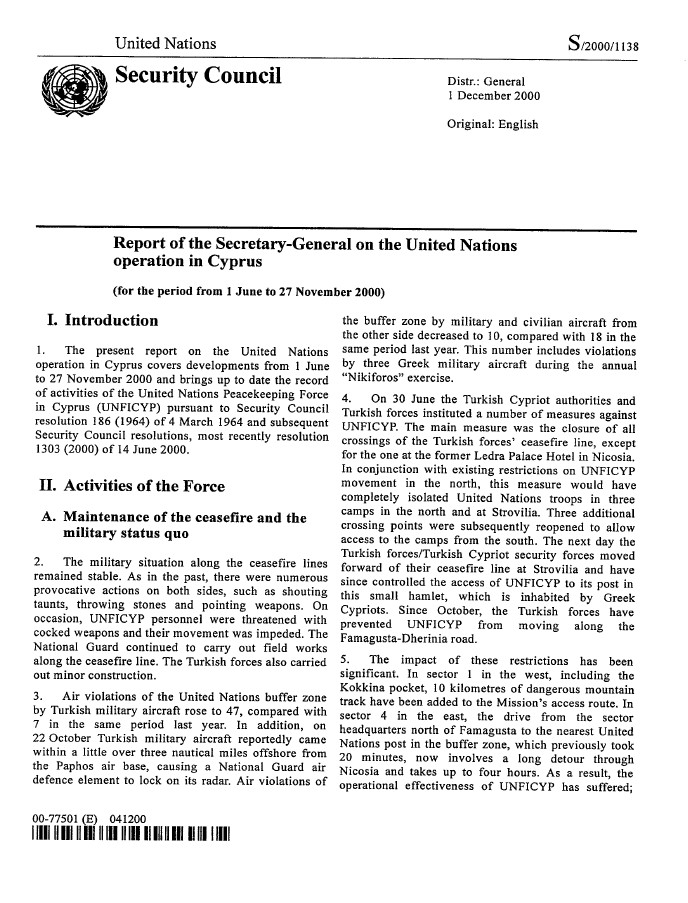 | Yayın Adı | Report of the Secretary-General on the United Nations Operation in Cyprus (for the period from 1 June to 27 November 2000) |