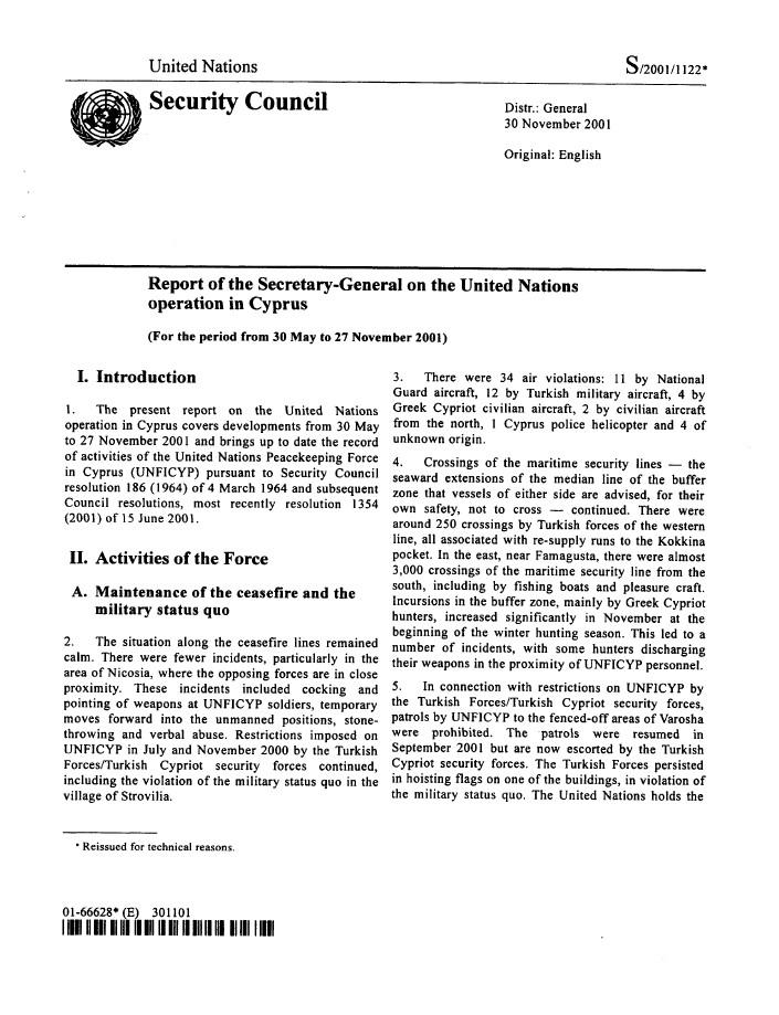 | Yayın Adı | Report of the Secretary-General on the United Nations operation in Cyprus (for the period from 30 May to 27 November 2001) |