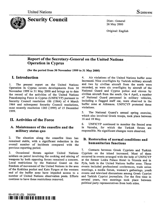 | Yayın Adı | Report of the Secretary-General on the United Nations Operation in Cyprus (for the period from 30 November 1999 to 31 May 2000) |