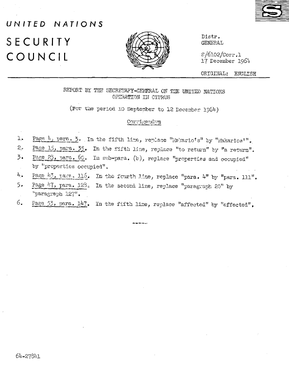 | Yayın Adı | Report on the United Nations Operation in Cyprus, for the period 10 September to 12 December 1964 : [corrigenda] |