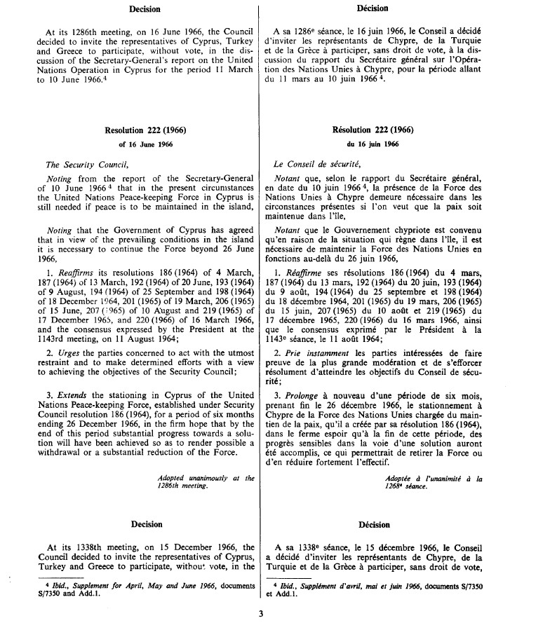 | Yayın Adı | Resolution 222 (1966) / [adopted by the Security Council at its 1286th meeting], of 16 June 1966: Security Council resolution 222 (1966) [on extension of the stationing in Cyprus of the UN Peace-keeping Force] |