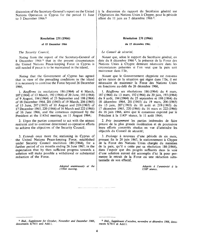 | Yayın Adı | Resolution 231 (1966) / [adopted by the Security Council at its 1338th meeting], of 15 December 1966: Security Council resolution 231 (1966) [on extension of the stationing in Cyprus of the UN Peace-keeping Force] |
