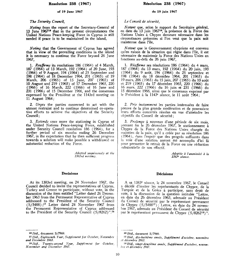 | Yayın Adı | Resolution 238 (1967) / [adopted by the Security Council at its 1362nd meeting], of 19 June 1967: Security Council resolution 238 (1967) [on extension of the stationing in Cyprus of the UN Peace-keeping Force] |